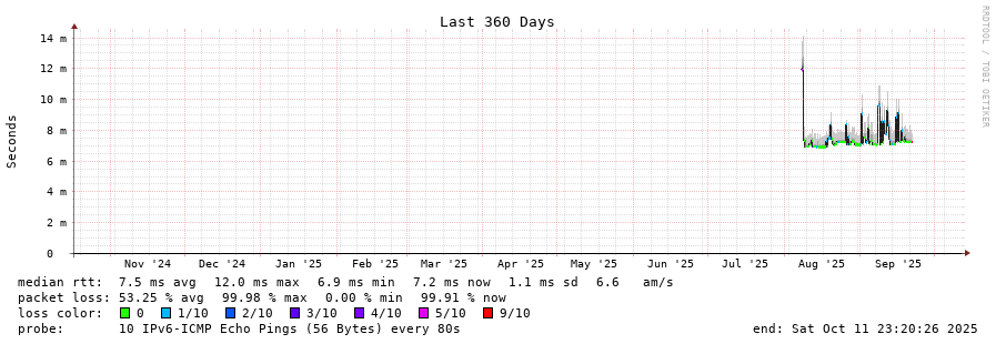 12 > 2603:10a0:f06:1105::356 (2603:10a0:f06:1105::356) [*] 6.257ms 6.290ms 6.232ms