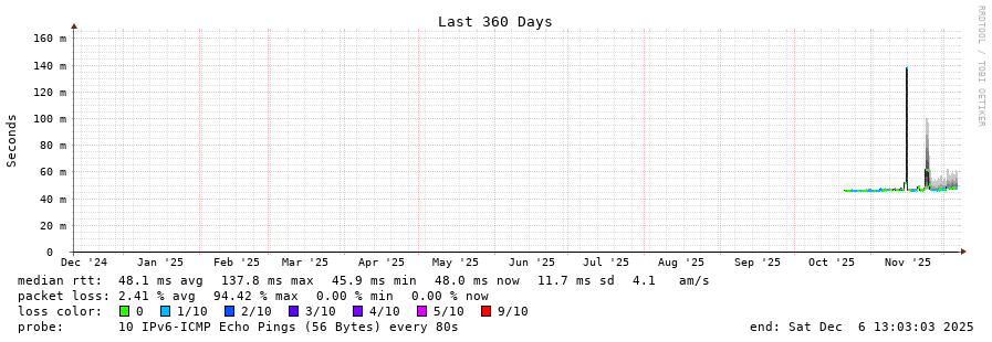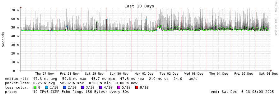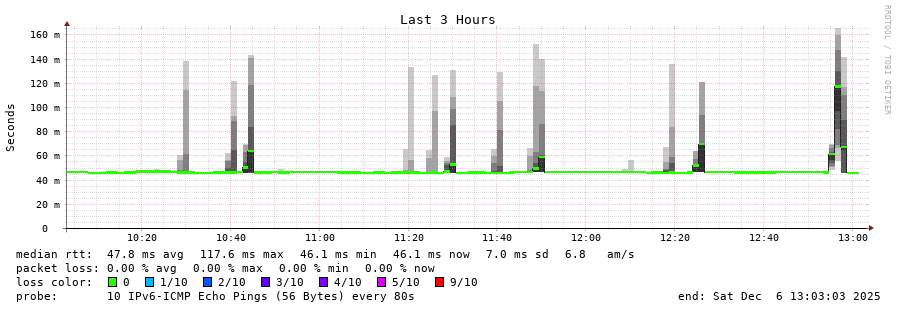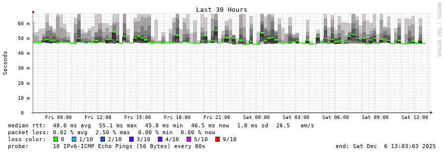 traceroute to 2a0c:9a40:8610:e3f::1 (2a0c:9a40:8610:e3f::1), 30 hops max, 80 byte packets - Generated at 2025-12-06 13:00:01