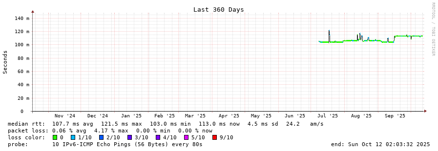 traceroute to 2604:2dc0:101:100::197c (2604:2dc0:101:100::197c), 30 hops max, 80 byte packets - Generated at 2025-10-12 01:15:01